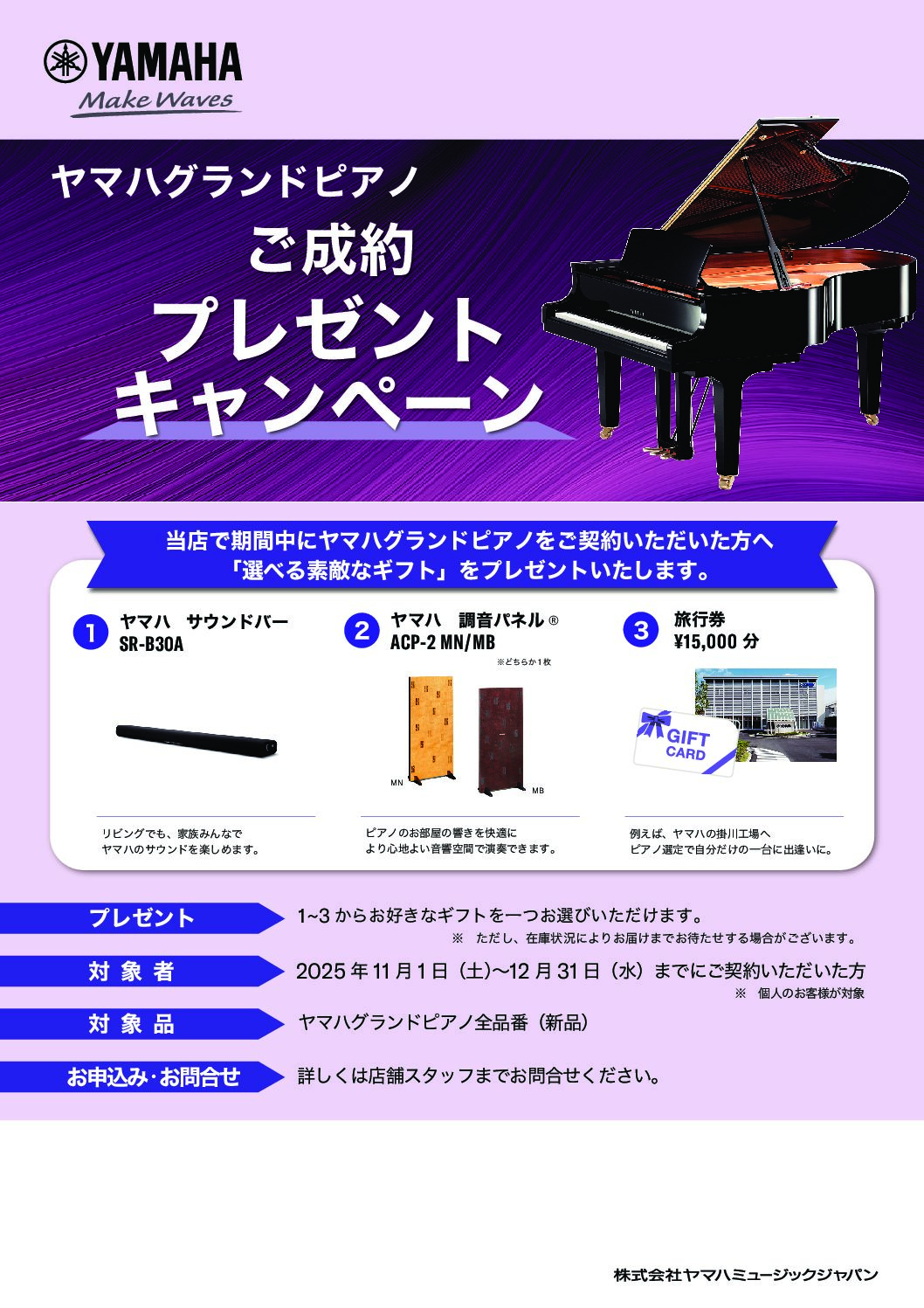 【News】ヤマハグランドピアノご成約プレゼントキャンペーン 2025 11/01 News 2025年11月1日 2025年11月1日から12月31日までにヤマハの新品グランドピアノをご成約いただいた方に 「選べる素敵なギフト」をプレゼント致します。 当店にはC3Xがありますので是非ご指弾いただければと思います♪ あわせて読みたい YAMAHA C3X News 【コンサート情報】2025年11月27日 関連記事 【News】ヤマハからのお知らせ 2025年7月31日 2024.05.19 彫刻と音楽の時~彫刻空間でのフルートとピアノの調べ~ 2024年5月23日 2024.1.1 能登震災支援コンサート 2024年3月23日 新しいホームページが完成しました 2023年12月14日